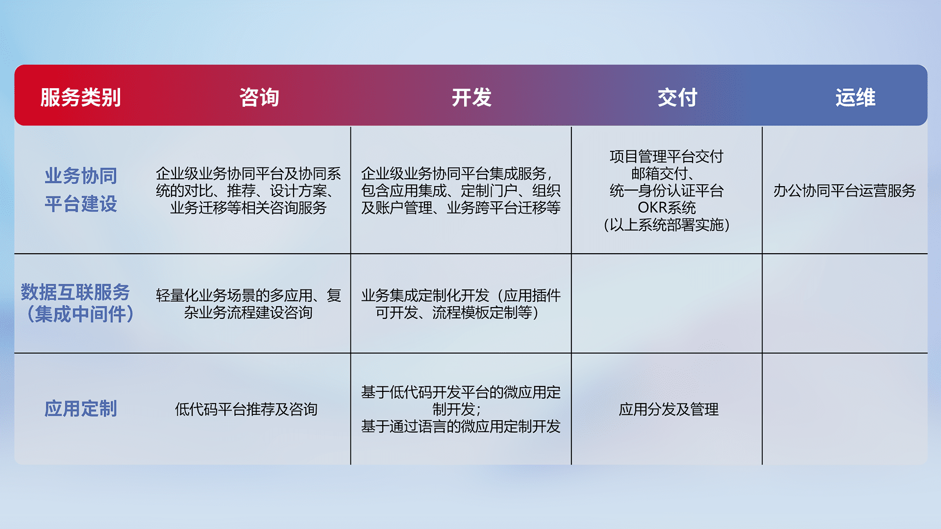 针对钉钉、、、企微、、IDaas等平台级产品提供产品的规划、、、方案、、交付、、、、定制化开发等服务,,,实现如统一协同办公、、智能客户服务、、、混合会议管理、、、智能数据查询、、、等业务场景,,,,实现数字化转型。。。。