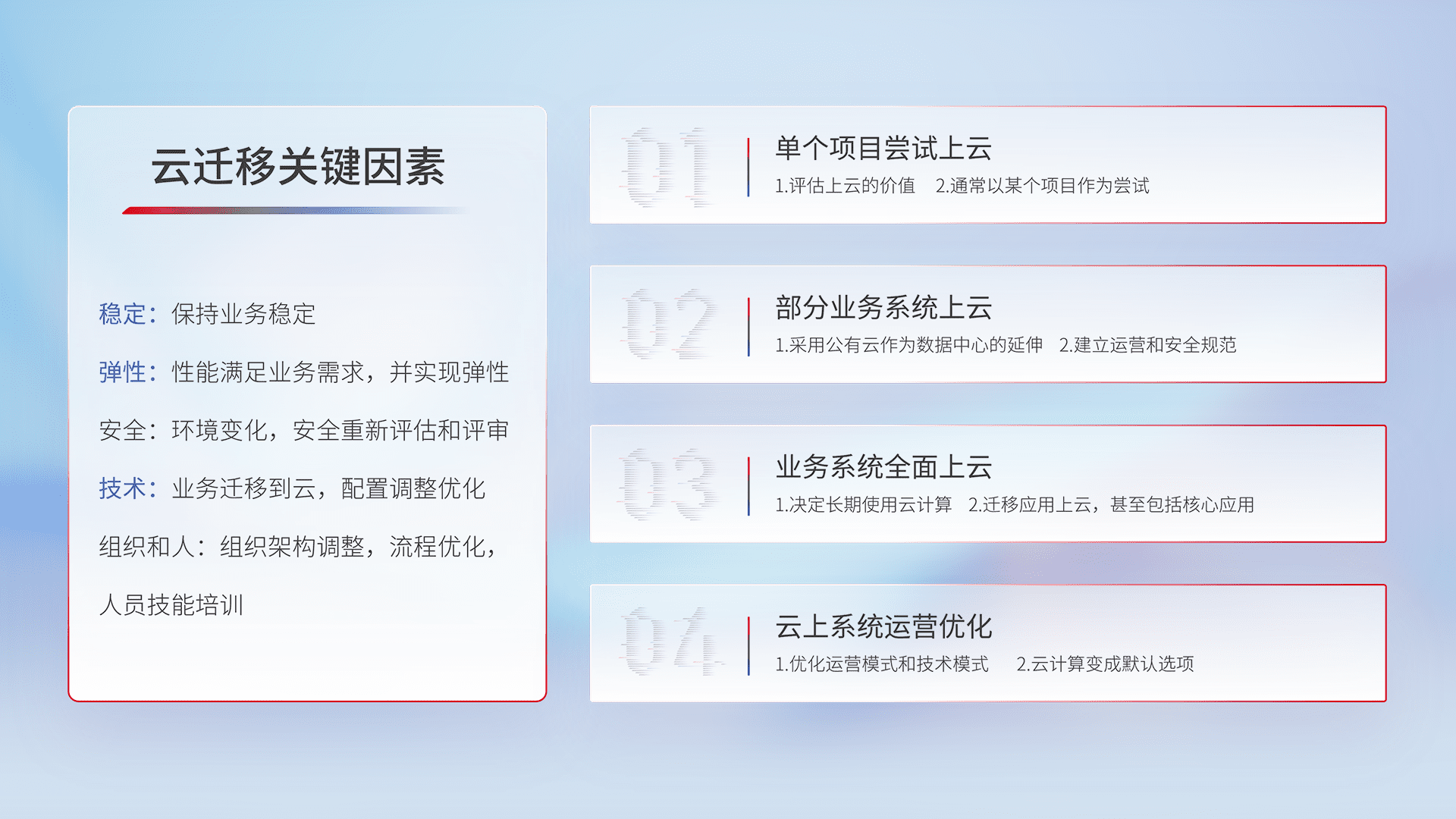 结合实际业务,,,从规划设计、、云平台选型、、云原生改造、、、、数据迁移、、、集成交付,,,迁移全过程为客户识别最佳上云路径,,,做好风险识别管理,,,设计网络架构、、、、身份权限、、、、安全审计合规、、、操作审计、、日志审计、、监控告警策略、、、、多站点容灾设计等,,,对云上基础设施进行整体规划,,,提升IT治理水平,,,以满足弹性、、、高可用、、、高性能的需求。。。。