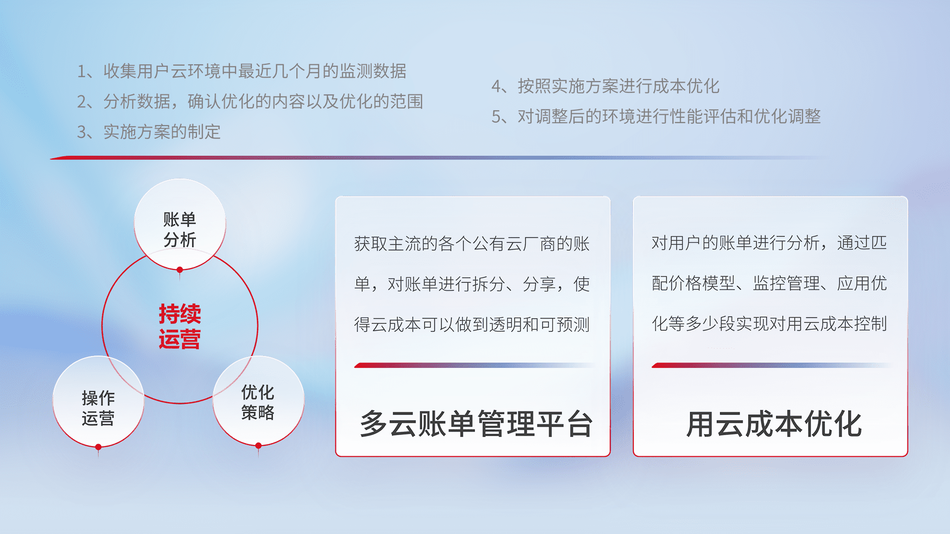 通过多云纳管,,,以统一的资源数据模型把客户的云资源进行抽象和封装,,进而实现对多云资源的统一操作,,,保障云资源管理的可靠性、、、稳定性与可用性。。。量身定制化运维内容,,,配置、、、开发运维、、补丁管理、、、备份、、监控、、认证和访问管理、、审计和日常巡检等,,保障在用云过程中的可靠度,,,,稳定度以及高可用率。。。。