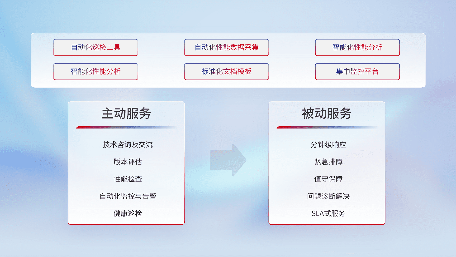 智能化工具和标准化文档,,保障服务质量,,,,提供主动服务(包含技术咨询、、、版本评估、、性能检查、、、自动化监控与告警、、健康巡检)和被动服务包含(分钟级响应、、、紧急排障、、值守保障、、、、问题诊断解决、、、、SLA服务)。。。